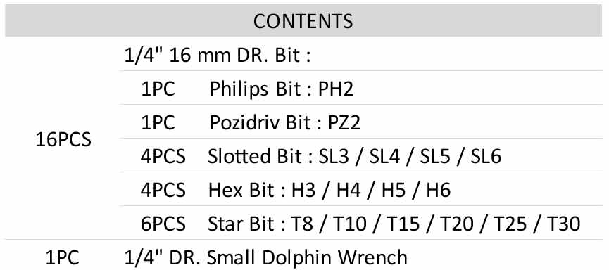 Advanced Search 1/4" 3/8" 1/2" 3/4" 1" 1-1/2" Home » Pneumatic Tool Manufacturer » HAND TOOLS » Bits Series » Ratchet Bit Sets » 17PCS 1/4"DR. Sockets & Bits Set 17PCS 1/4"DR. Sockets & Bits Set Model : BS-8620A-17 Q'ty : Add To Inquiry Specifications BS-8620A-17 17PCS 1/4"DR. Sockets & Bits Set Related Products 14 PCS Flexible Professional Screwdriver SetModel : FLS2 Add To Inquiry 8PCS 3/8 " Stubby Bit Set-SAEModel : BS05208HBC-2 Add To Inquiry 24PCS Bit Set W/ProRatchet WrenchModel : BS10024S1 Add To Inquiry 26PCS Bit Set With Pro Ratchet Wrench_12 & 19mm(H)Model : BS05226KBC Add To Inquiry 10PCS 3/8 " Stubby Bit SetModel : BS05210TBC Add To Inquiry 7PCS 3/8 " Stubby Bit Set Tool SetModel : BS05207MBC Add To Inquiry