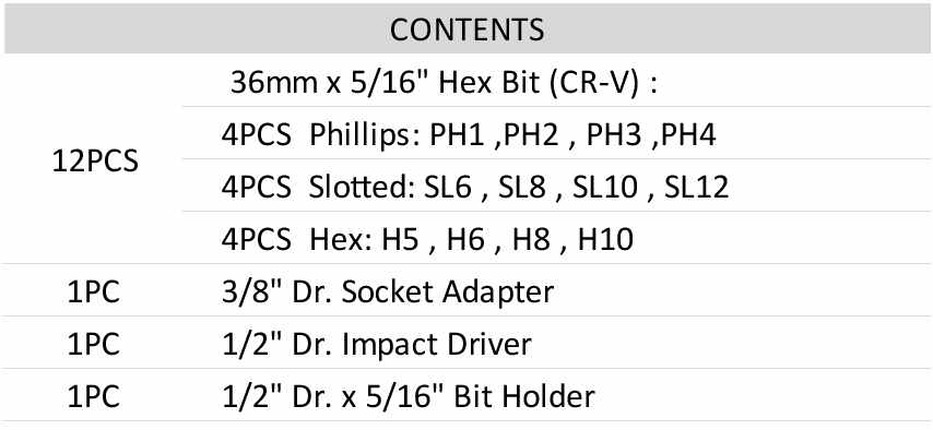 Advanced Search 1/4" 3/8" 1/2" 3/4" 1" 1-1/2" Home » Pneumatic Tool Manufacturer » HAND TOOLS » Bits Series » Impact Driver Sets » 15PCS Impact Driver Set 15PCS Impact Driver Set Model : BS-6349B Q'ty : Add To Inquiry Specifications BS-6349B 15PCS Impact Driver Set Related Products 15PCS 3/8" Micro Impact Driver SetModel : BS-2811 Add To Inquiry 1/2" DR. Impact Screwdriver Set (5PCS)Model : BS-0205K Add To Inquiry 3/4" DR. Heavy Impact Driver Set (13PCS)Model : BS-0313K Add To Inquiry 18PCS 3/8" Micro Impact Driver SetModel : BS-2814 Add To Inquiry 1/2" Heavy Duty Impact Driver W/8PCSx36mm Bits CR-VModel : AGT-00175 Add To Inquiry 1/4" DR. 2-IN-1 T-Handle Socket Screwdriver Extension Set (30PCS)Model : BS-0030K Add To Inquiry
